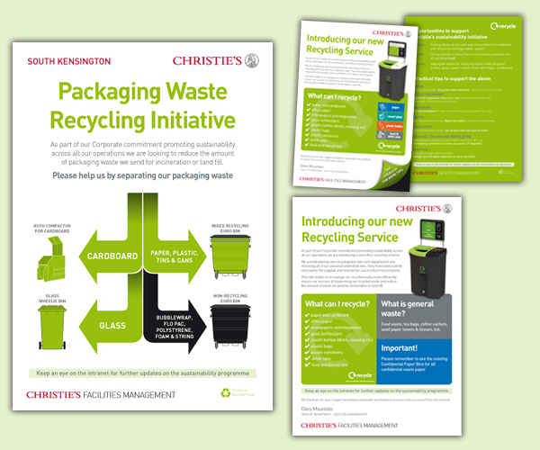 Project managed through an existing client, Christies required a marketing pack to assist with the launch an internal initiative on recycling. Comprising of posters, flyers and bin stickers, it was important that all material flowed within their corporate styling.
