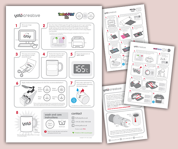 While we create a number of different elements for Yolo's marketing, one of the largest is their Instruction Sheets. They sell a wide range of heat transfer papers, each with their own specific set instructions of use so it was felt that the clearest way to guide their customers through them was by the use of illustrations.